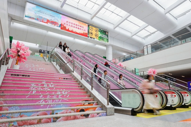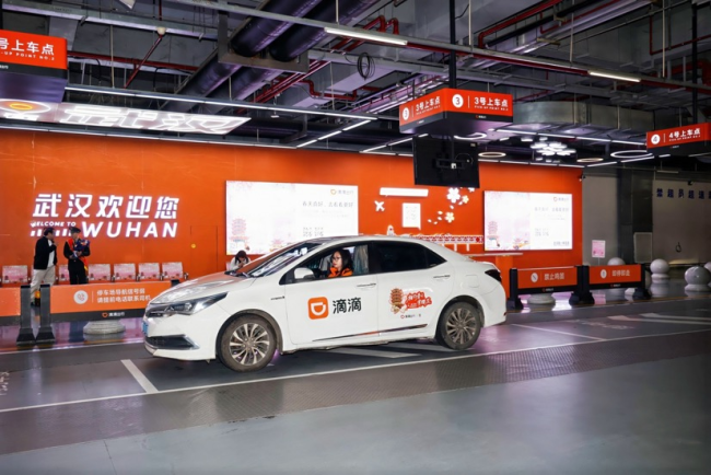图组为:滴滴在多地发放赏花地图,在武汉天河机场设置赏花氛围引导